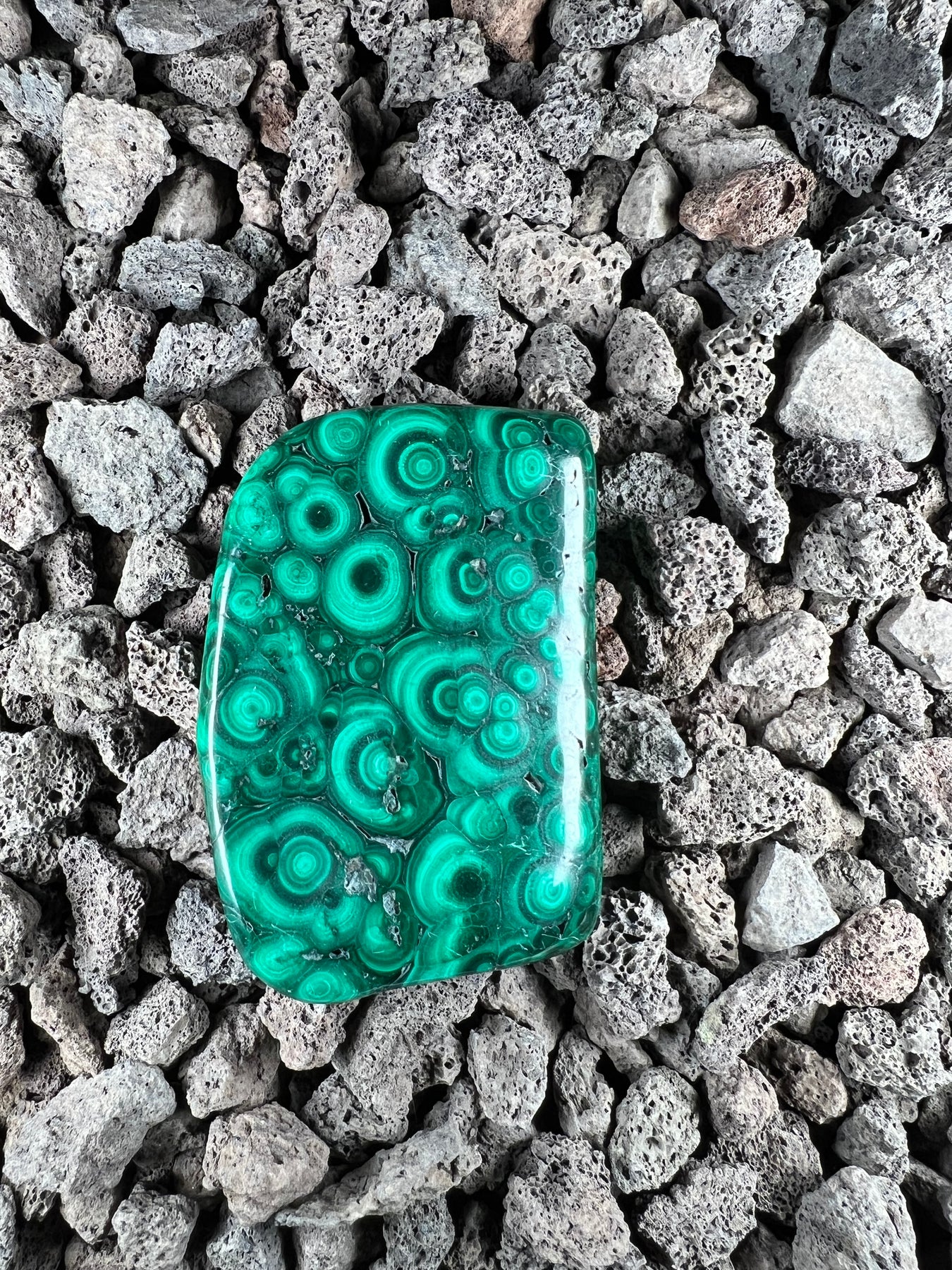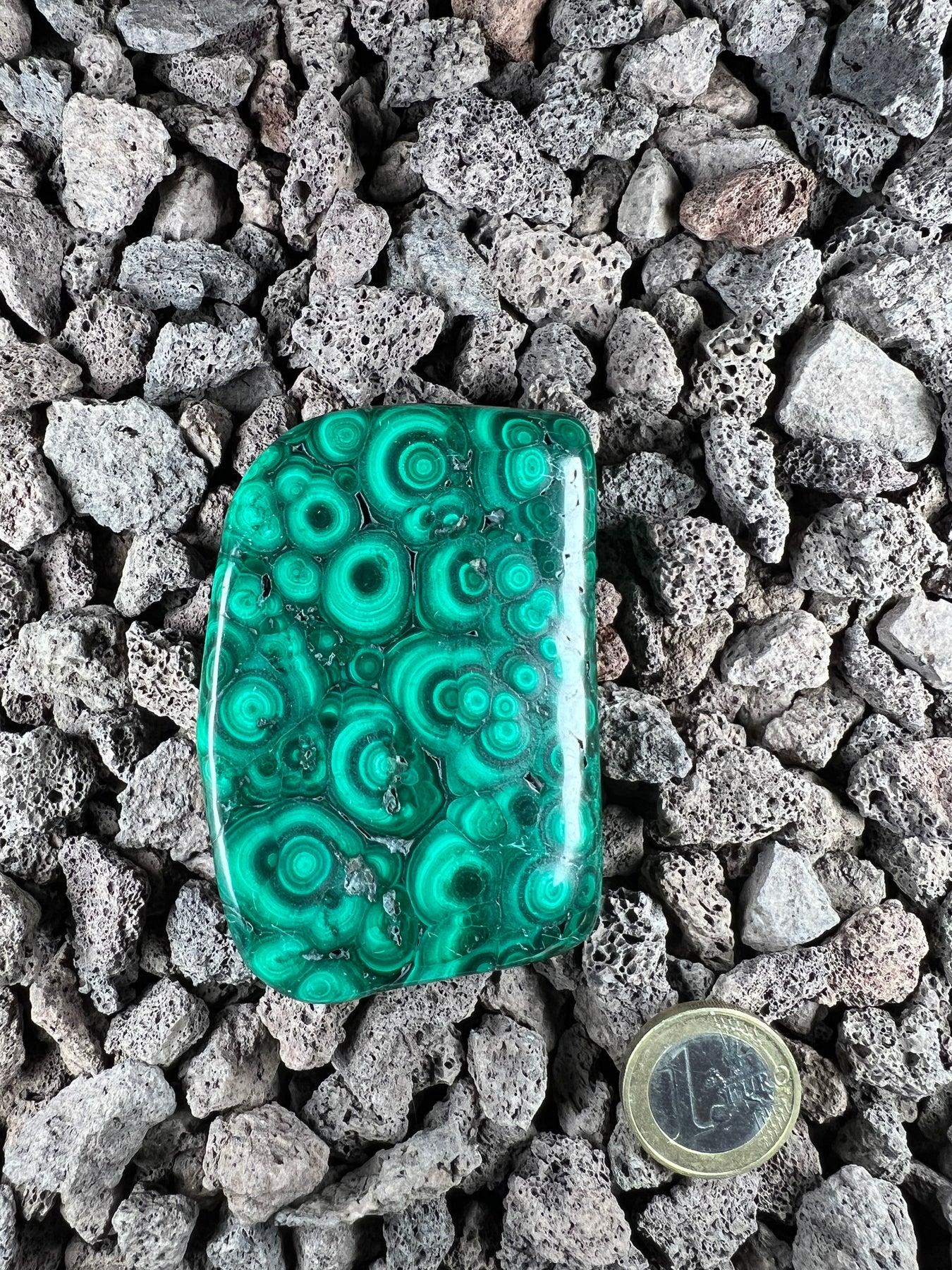 Mit ihren lebendigen, satten Grüntönen und den charakteristischen Wellen- und Kreisstrukturen ist Mala nicht nur optisch beeindruckend, sondern auch energetisch stark spürbar. Malachit gilt seit Jahrhunderten als Stein der Wandlung, des Schutzes und der emotionalen Heilung.